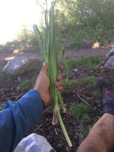 While I was taking a rest and refilling water, Honey Bee and Hidalgo passed by and pointed out the green onions (scallions) that were growing alongside the trail. YES! FOOD! I pick a handful, rinse the dirt off in the stream, and start chomping away. I kid you not, at this point, the sensation of chewing and swallowing is euphoric, and I’m honestly not sure if my eyes are watering from the onions or from the joy. I pack up some scallions for later, and push on.